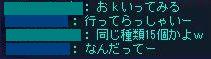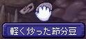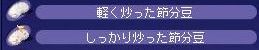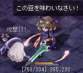 ボリスの笑顔か……グラフィックのあれで私は十分だけどな。 ルシなみに全開の笑顔も1度くらいはいいかもしれませんが たぶん見てるこっちが恥ずかしい。うん。 面白いのがいっぱいで読んでて楽しかったです、願い事。 テチがほうきに乗って空を行くならルシはスケートで地面を行くさー。 今度のイベントは節分。 お豆イベントって初めてです、この時期は米粉とかゼラチンとか集めるのに 奔走してた覚えしかないや。 豆っていうのは小さいもののたとえだったはずなのですが でかいよ、豆。 ミスティックの鎖ってだいぶ重たいシロモノなのに、それと同等の大きさの豆ってそれは本当に豆ですか。 いや、リアルサイズにしたら落ちてるのにまず気づかないでしょうけども! 混乱9でお金稼ぎのためにピコックとバッドブロウとミスティックを狩っていたのですが たまーにボリスのレベルでも落っこちるみたいです。 重量いっぱい狩りを2回して、2種各7,8個くらいの落下率です。 でもAD2よりはまだ落ちる方かなぁ。。。混乱9。 炒った豆からは芽が生えない……と思うのですが、しっかり炒った豆の方から 芽が出てるように見える。 何の昔話だったかなぁ。。。 鬼に炒ったお豆を投げつけて、「この豆から芽が出たらうちの娘を嫁にやる」って 鬼を追い返す話があったような。 イベント会場がクラドの村長さんのお宅。 そんな狭い場所に行ったらイベント期間が終了するまで 村長さん宅にボリスが囚われの身になります。 ――ので、2種合わせて15個あった豆をクラメンさんに贈呈して 様子を見に行ってもらいました。 豆の種類でちび鬼か大鬼か決まるんでしょうかね。 退治法は豆投げじゃなくてあの大きさじゃむしろ砲丸投げ…… 鬼には投げられないので、その辺の敵に投げてみた。 投げても投げても減らない不思議豆。 これは明日また修正が入るでしょうね。 イベントの紹介ページにあったGMさんの頭上にある台詞も 豆を投げたら自動的に出るもののようで。 他に 豆腐より納豆の方が投げられたら嫌だ。 影塔の敵のHP、いくつあると思ってるのー どうにも負け惜しみの台詞に聞こえてしょうがない。 最後は『ふっ、今日はここまでにしておいてやる』で逃亡するしかなさそうな。