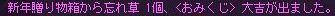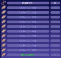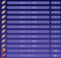 拍手の中身が変わってなくて申し訳ないです; ナルビクの街をてろてろ歩いていたら気になる看板を出してる人がいました。 『出:おみくじ凶 求:100k』 ルシアンとボリスで結構な数を引いてますけど いまだに出たこと無いんですよね……『凶』 ほんとにあるのかなぁ…リアルで噂されている大凶の存在並みに気になります。 100k出して見せてもらえばよかったかな? ↑ルシアン ↑ボリス 『大吉5 中吉4 末吉1』 『大吉1 中吉3 小吉3 末吉3』 今のところ、おみくじの結果はルシアンの方がいいです。 その辺は『らしい』かも。 でも出してるアイテムはボリスの方がいいんですよね…期限が1日で短いですが。 ボリスの方でも出て地味に集まってます、忘れ草。 あと3本。 無事に集まれば即ルシのCP2を始められるんだけれど… 期間内に集まらなかったら、 ボリスの方でフリークエストをやって龍泉の佳実さんから貰わねばー 初夢は1月1日から2日の朝にかけてみる夢と |