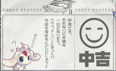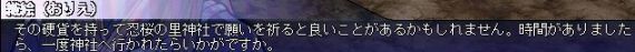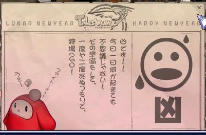 ようやく3個連続でマギカルディさんと合わせることができました。 そのあとすぐにまた詰まりましたけど。 去年の今頃、ルシで同じ目にあってました。 ルシはナルビク→エルティボ。 ジョシュ君はエルティボ→ナルビク。 往路でも復路でもクジラに飲み込まれた紅い射手はラックがゼロですか。 レベルが上がって打たれ強くなったら再挑戦します、今は骸骨が痛すぎて生き残れません。 昨日ひけなかったおみくじもひいてきましたよ。 去年のおみくじも内容が色々あって面白かったですけど、 ファイト~オ~~とは可愛いじゃないですか。何だっけ、この赤い物体。 ――それにしても死ぬつもりで狩場へGOとは;; だ、だいじょうぶですよ、今日はチムで狩り予定ですから死んでも助けてもらえます、 けど さいさき悪すぎるのでもう一個引きました。 よし、普通。 3枚持っていったので、もう一枚は絵馬に。 間違えてお賽銭を投げ込む池にぽっちゃんしたり 絵馬掛けのついたての向こう側に放り投げてしまったり ―――つまり昨日の分も含めまだ1枚も書けていません。 凶おみくじはちゃんと結べたのになぁ(そしてしっかり暗闇5分のペナを貰った。 うをー、、コツが分からない…… 昨日の交通安全……じゃなくてなんでしたっけか。 速度が上がるお守りの効果は10分間でした。混乱9まですいすいっと走れます。 便利だなぁ、疾風の薬草80本持ってるけれどこっちの方が 時間を気にしなくて良いぶんCPの走りぬけフロアとかで使えそう…… 巫女さんに多めに貰っとこうかな。 くりすますが終わったら、ゆく年くる年…慌しいですね。 神社ってどこだったっけ?と村の裏手にある墓地をしばらく放浪してました。 織絵様のおうちのちょっと先でゲートを発見。 お賽銭……ではなくて これを持っていたらゲートが見えます。 ナルビクの外のゼリッピを叩いても 忍桜の里のそとのにゃでしこを叩いても ボリスのレベルでも簡単に手に入ります。 レアドロだとは思ってなかったから降って来た時はちょっとびっくりした…… 見た目は10円、でも硬貨に書かれている数字は『5』 ……ご縁? 鳥居の先にいる巫女さんに渡したら、おみくじかお守りがもらえます。 旅行安全のお守りは移動速度が速くなるそうですよ。嬉しいなぁv 今日はお賽銭を2枚しか持ってこなかったので、おみくじはまた次回。 もう一枚は池にちゃぽん。 特殊効果はとくに無く、ひっそりとスロットに絵馬が入りました。 貰ったはいいけど、書き方がわからないぞ…… ダブルクリックしたら『ここにはつかえません』と出るし――うーん?; まぁそのうちわかるでしょう。 干支のペンダントを集める方にも手を付けてみましたが、 1時間ほど紅道で奮闘してみたものの、2個しか手に入りませんでした。 敵とのレベル差があると落ちないよ、と言われたものの ボリスの次に下のレベルってジョシュ君だし…… ジョシュ君はボリスの三分の一くらいのレベルしかないし…… 1個10kで販売していますけど、各種5個ずついるからだいぶお金がかかってしまうんですよね;; こっちはちょっと無理そうです。 カウルで売っちゃえ。 |
